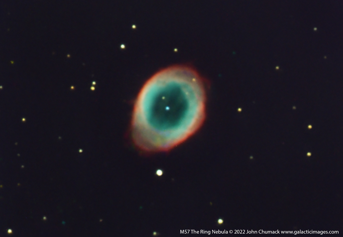 M57 shines at magnitude 8.8 and visually it is a delight, and we see it quite well in most telescopes with a little magnification as a smoke ring or Cheerio in the sky. its diameter is 2.6 light years and is located 2,283 light years from Earth.