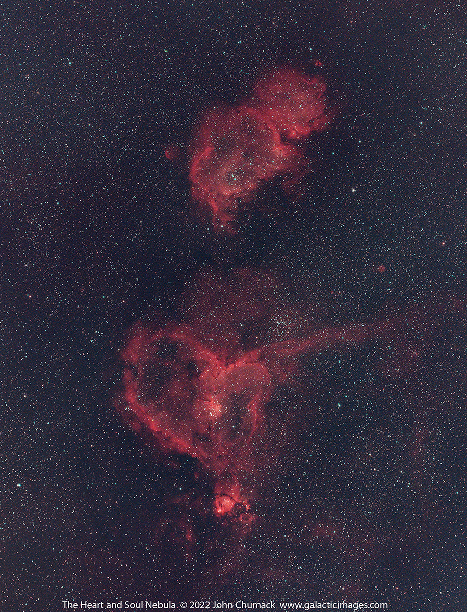 The Heart Nebula, IC 1805, Sharpless 2-190, is some 7500 light years away from Earth and is located in the Perseus Arm of the Galaxy in the constellation Cassiopeia.
